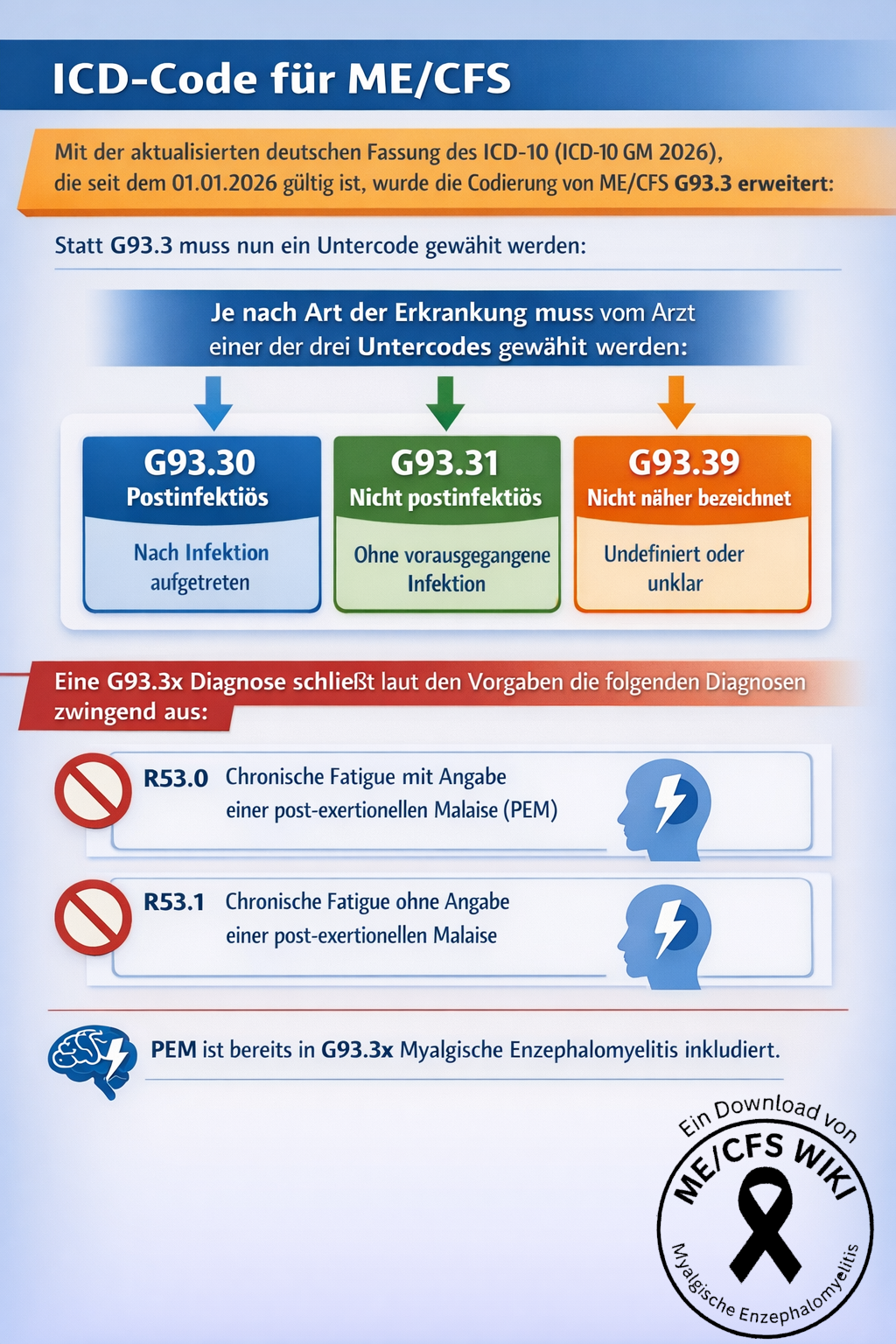 Damit wird klargestellt, dass PEM bei ME/CFS bereits inhärenter Bestandteil der Erkrankungsdefinition ist und das Symptome somit nicht nochmals über R53-Code abgebildet werden dürfen.
