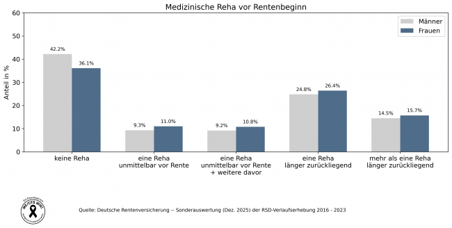 Für den Zeitraum 2016 bis 2023 zeigt sich eine leichte Zunahme von Reha-Maßnahmen vor der Rente. Aber immer noch 42 % der Männer und 36 % der Frauen hatten fünf Jahre vor Rentenbeginn keine medizinische Rehabilitation.