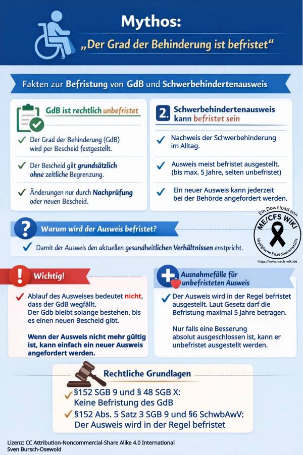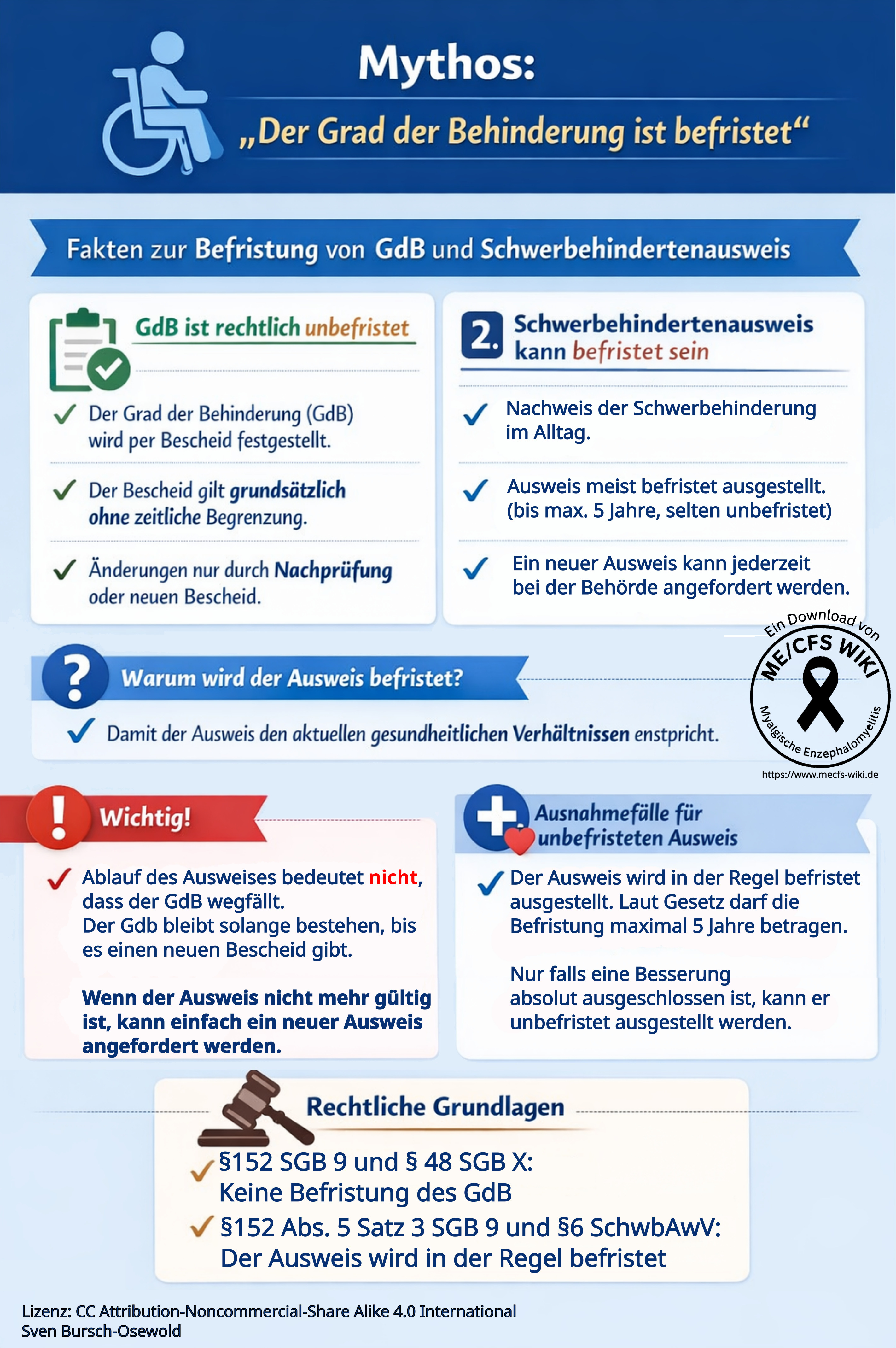 Immer wieder gibt es Aussagen, dass der Grad der Behinderung befristet sei. Rechtlich ist diese Aussage schlicht falsch. § 152 SGB 9 sieht keine Befristung des Grads der Behinderung vor.